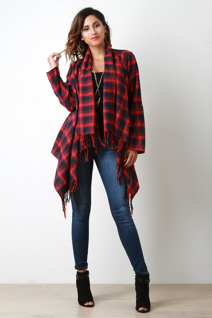 This cozy cardigan features an open draped front, shawl collar, fringe hem, long sleeves with the option to roll up and secure with a button tab. Accessories sold separately. 90% Cotton, 10% Polyester.