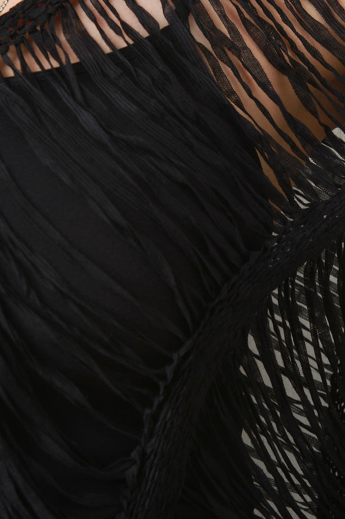 This poncho features a semi sheer design, shredded stripe knit fabrication, simple boxy fit, long sleeves and a asymmetrical hemline. Accessories sold separately. 85% Acrylic 15% Polyester.