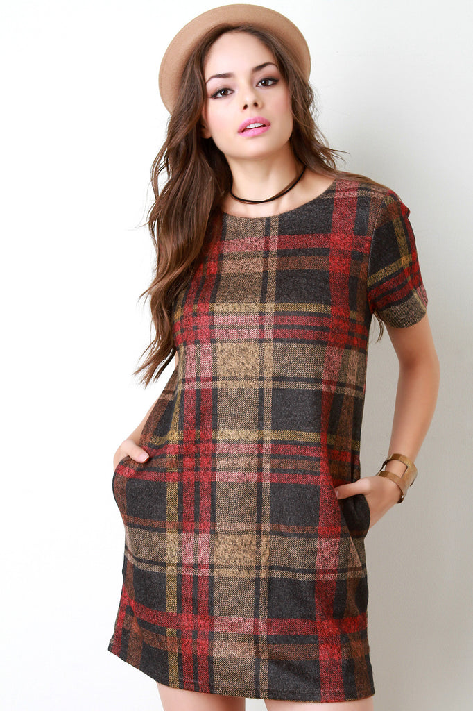Plaid Wool Short Sleeve Pocketed Mini Dress