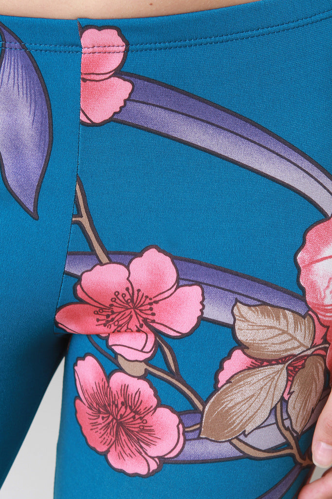 These pants features a bell bottom flare, elasticized waist, and floral print. Accessory sold separately. 95% Polyester, 5% Spandex.