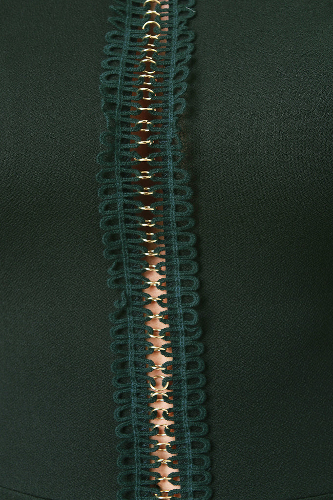 This midi dress features a round neckline, sleeveless design, center vertical slits trim with lace and ringlets, keyhole back, and cinched waist seam. Accessories sold separately. Made in U.S.A. 95% Polyester, 5% Spandex.