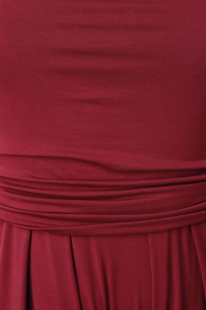 This plus size jumpsuit features a strapless, elasticized tube neckline, ruched side, elastic cinched waist, taper cut legs, and side pockets. Accessories sold separately. Made in U.S.A. 97% Rayon, 3% Spandex.