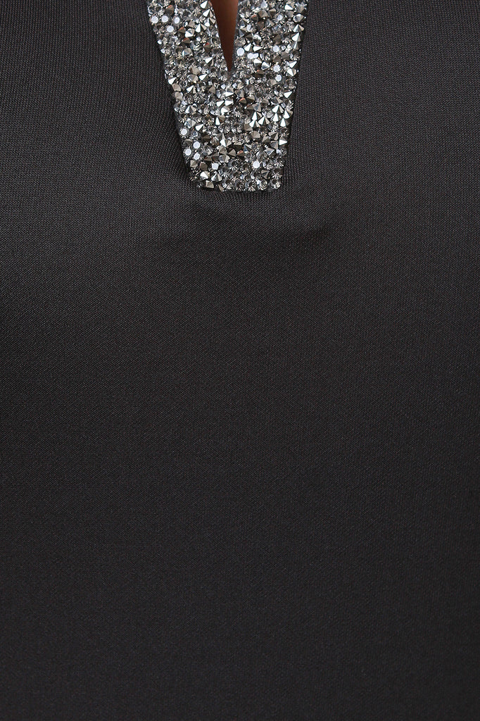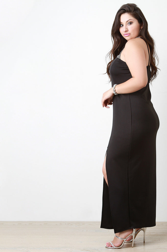 This plus size sleeveless dress is maxi silhouette. It has a round neckline with a yoke cutout, featuring encrusted faux gems. Elasticized collar line. Soft knit, unlined. Finished with a diagonal slit. Accessories sold separately. 92% Polyester, 8% Spandex.
