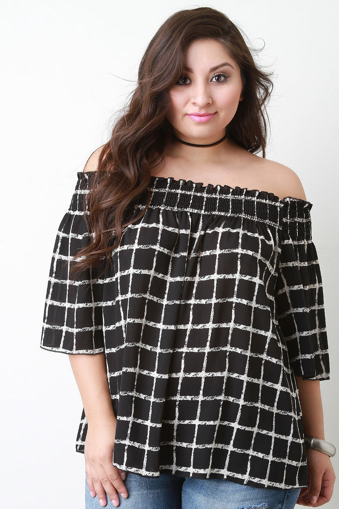 Off The Shoulder Grid Print Chiffon Top