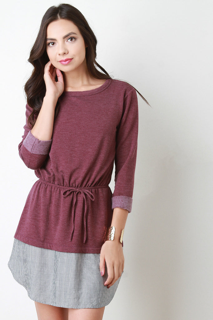 This dress features a round neckline, long sleeves with cuff, cinched waistline with bow tie at front, and skater flare skirt. Finished with a contrast stripe trim hem. Accessories sold separately. Self: 48% Polyester, 48% Rayon, 4% Spandex. Lining: 100% Rayon.