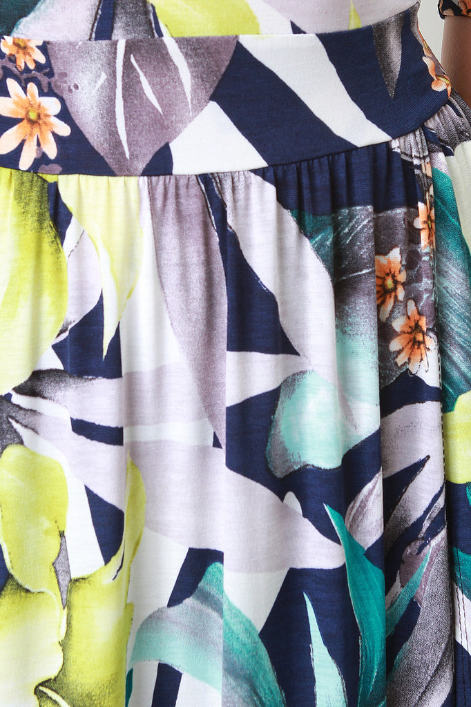 This vibrant dress features thin stretchy knit fabric, floral print design, elasticized off the shoulder neckline, and elbow length sleeves. Finished with a maxi-length hemline, high vent front slits, and boxer shorts underlay. Accessories sold separately. Made in U.S.A. 95% Polyester, 5% Spandex.