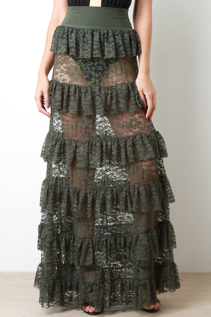 Semi-Sheer Floral Lace Ruffle Tier Maxi Skirt
