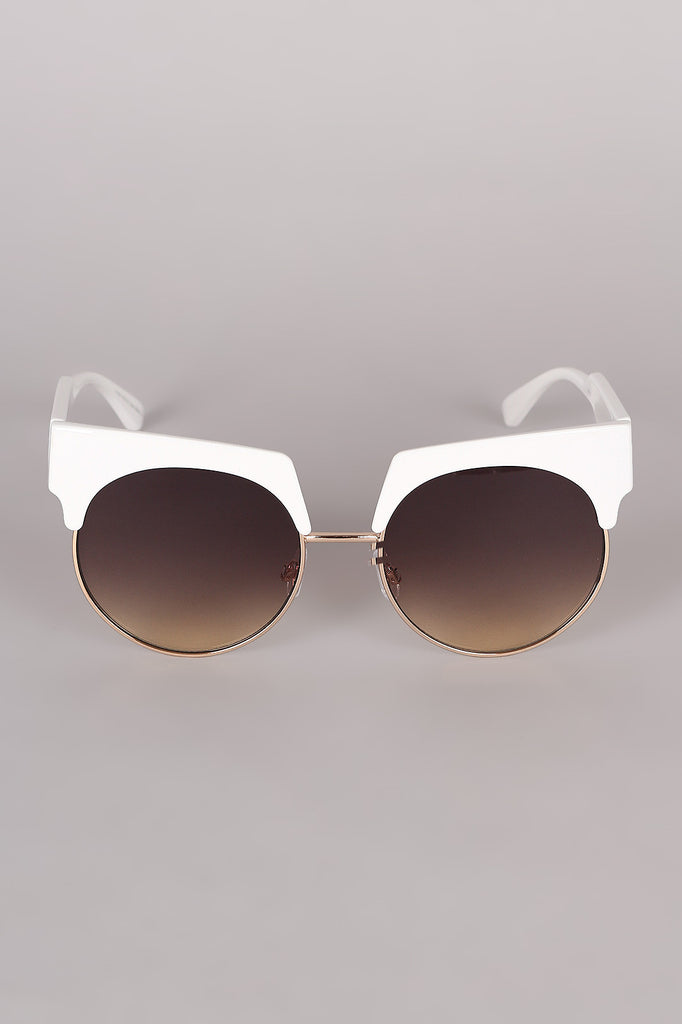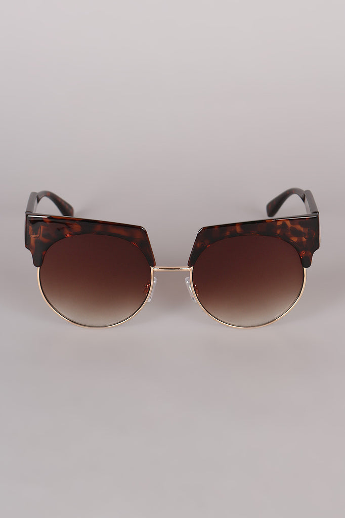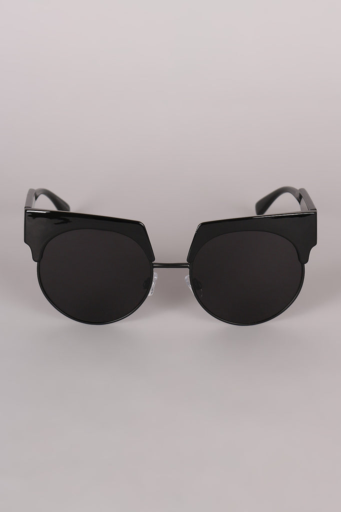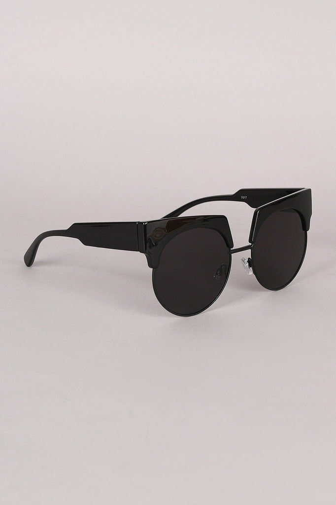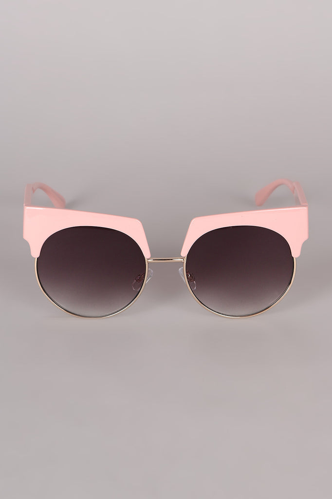 These sunglasses features a semi-rimless design, combination of metal and plastic framing, rounded lenses, and nose cushions.