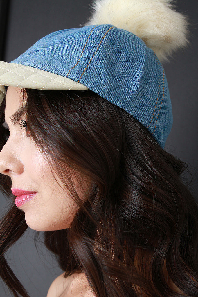 This hat features a vegan leather quilted bill, denim cap, classic 6 panel design, with a large fur pom pom sewn to the crown, with an adjustable slide buckle back.