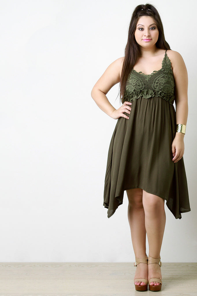 This plus size dress features a woven fabric, crochet yoke design, thin shoulder straps, open back, and handkerchief hemline. Accessories sold separately. Made in U.S.A. 100% Rayon.