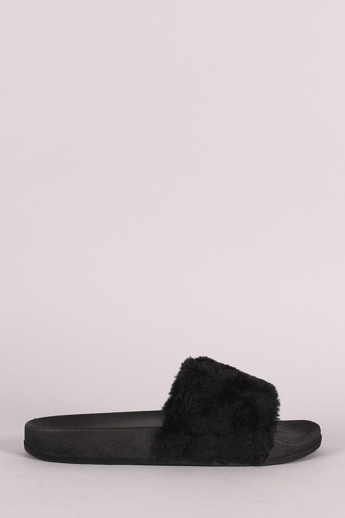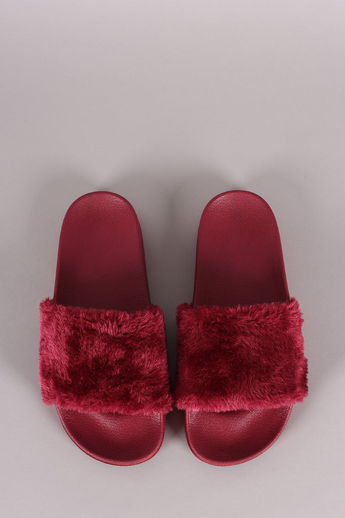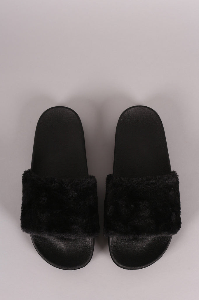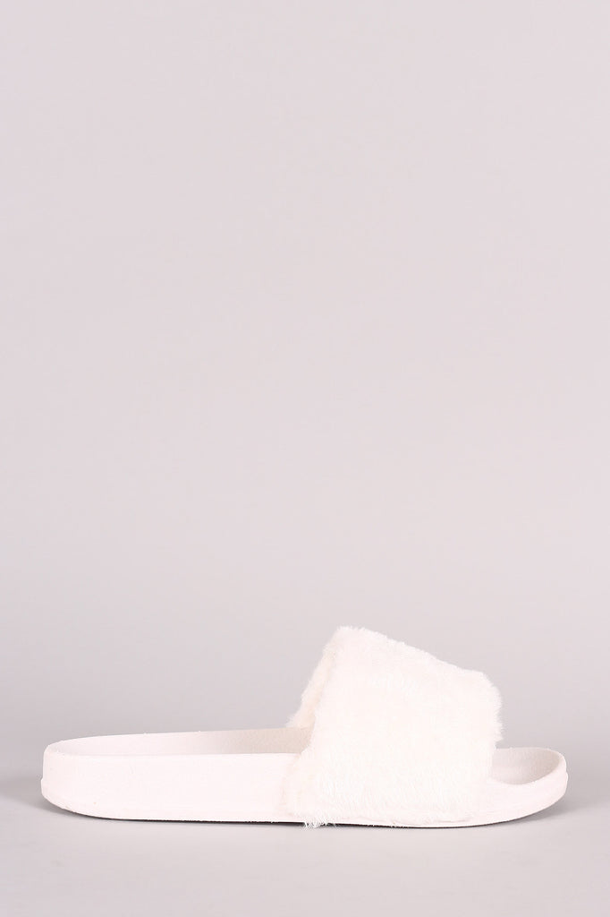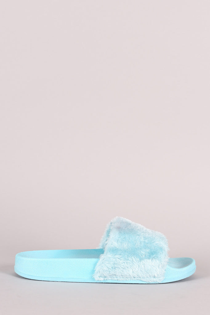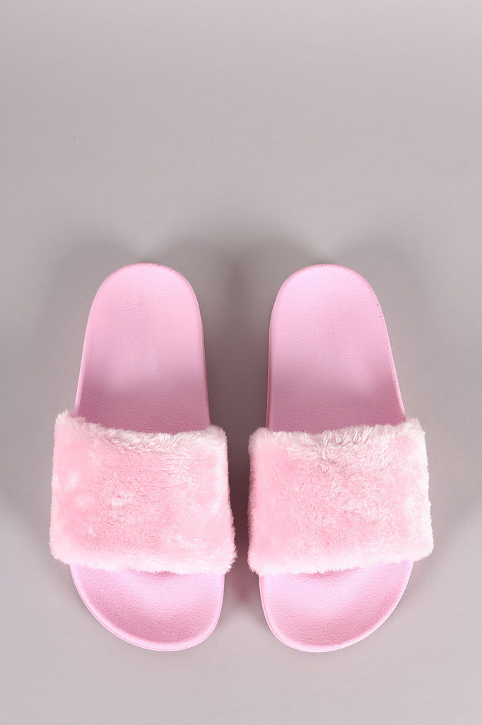 This sweet slide sandal features a wide band across vamp with soft faux fur trim and easy slip-on style.Material: Faux Fur (man-made)Sole: PVC
