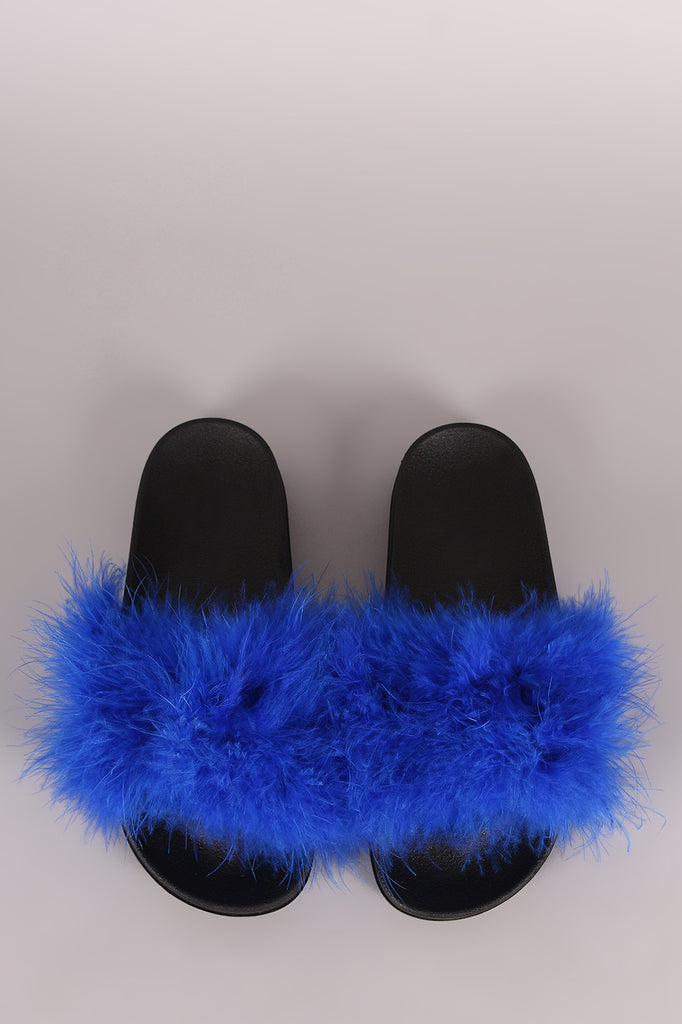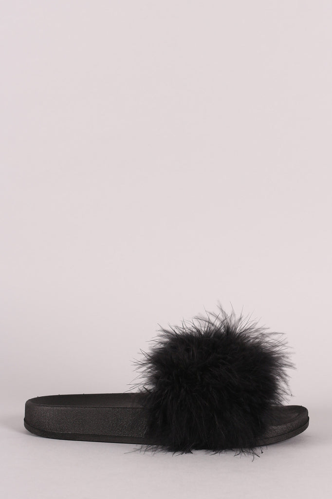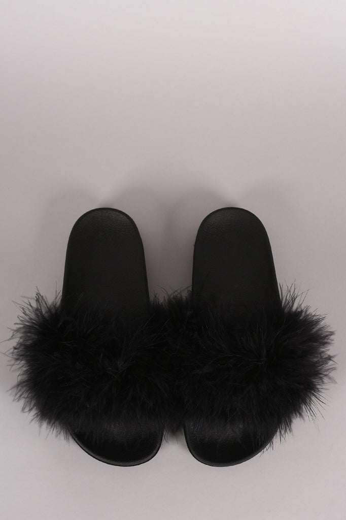 This fluffy slide sandal features a wide band across vamp with soft faux feather detail and easy slip-on style.Material: Feather (man-made)Sole: PVC